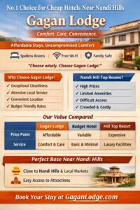 • When searching for nandi hills hotels near me, many options are faceless corporate entities. Gagan Lodge offers a personalized, homely touch. We combine the strategic location you search for with the genuine “Care” and cleanliness that our long-term guests rely on. We give you a better overall value and a far more pleasant stay than many of the high-priced alternatives.